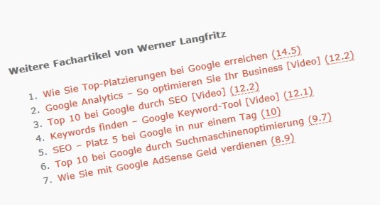 Das Erstellen eines Bereiches mit empfohlenen Beiträgen auf Ihrem Blog, ist auch unter SEO-Gesichtspunkten ein guter Weg, um neue Besucher auf Ihren besten Content direkt zu leiten und so Ihre besten Beiträge auch untereinander zu verlinken. Sie können dies unter dem Beitrag oder in der Fußzeile realisieren oder Sie verwenden einen Bereich in Ihrer Sidebar mit Hilfe eines Widgets (wie ich es hier auf Motivation-Erfolg-Reich.de tue). Ein Plugin, um dieses zu realisieren, ist „Must Read Posts„. Es fügt ein benutzerdefiniertes Feld auf Ihrer Artikelseite ein, indem die empfohlenen Beiträge angezeigt werden.